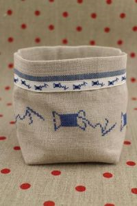 These little pots to embroider in cross stitch on linen are extremely simple to make: they are embroidered on a linen band so there is no hem to sew, nor any complicated stitching, just a few straight lines to mount the pot. They are embroidered using Sajou Calais cocoons and the ribbons come from the Sajou Couture Collection.